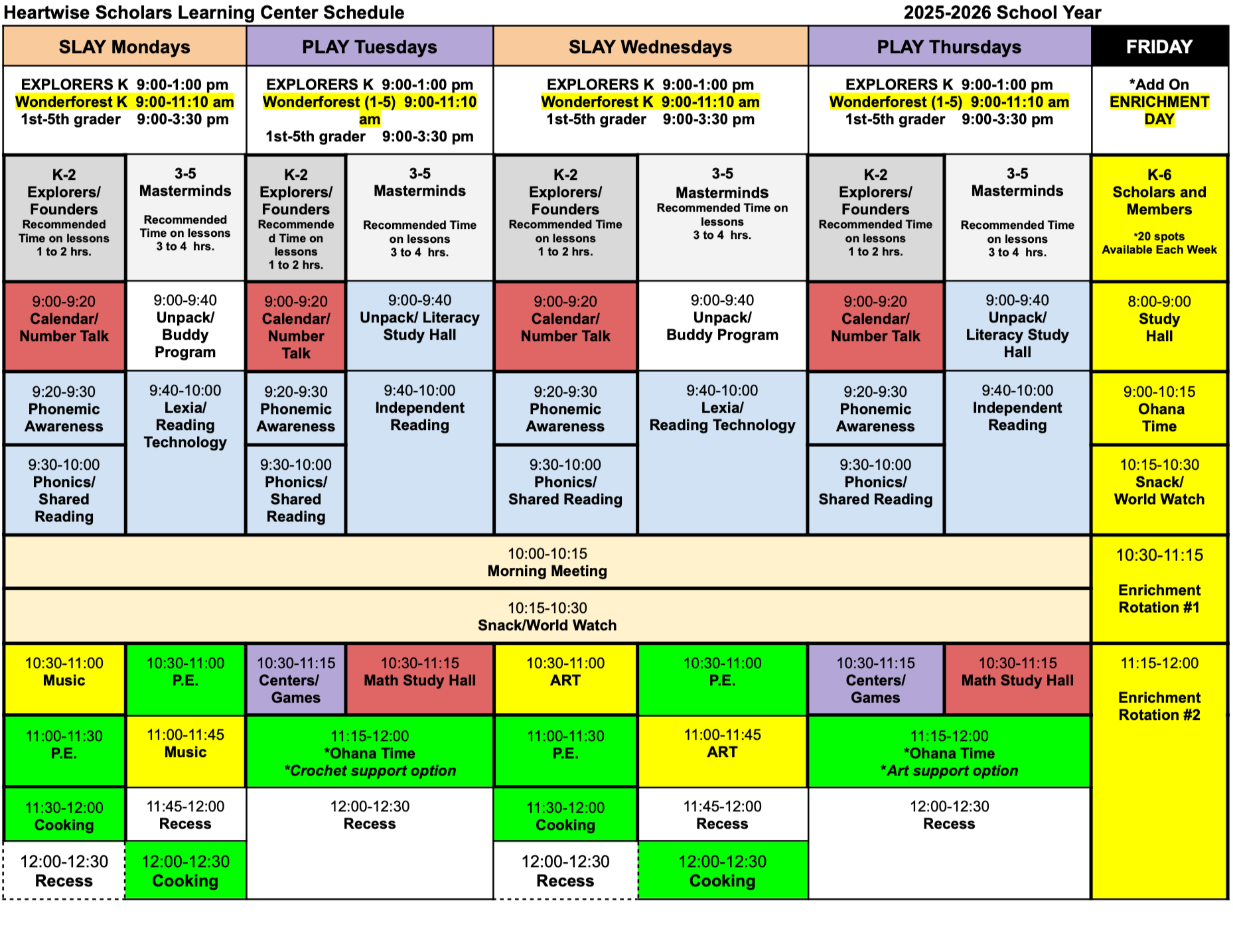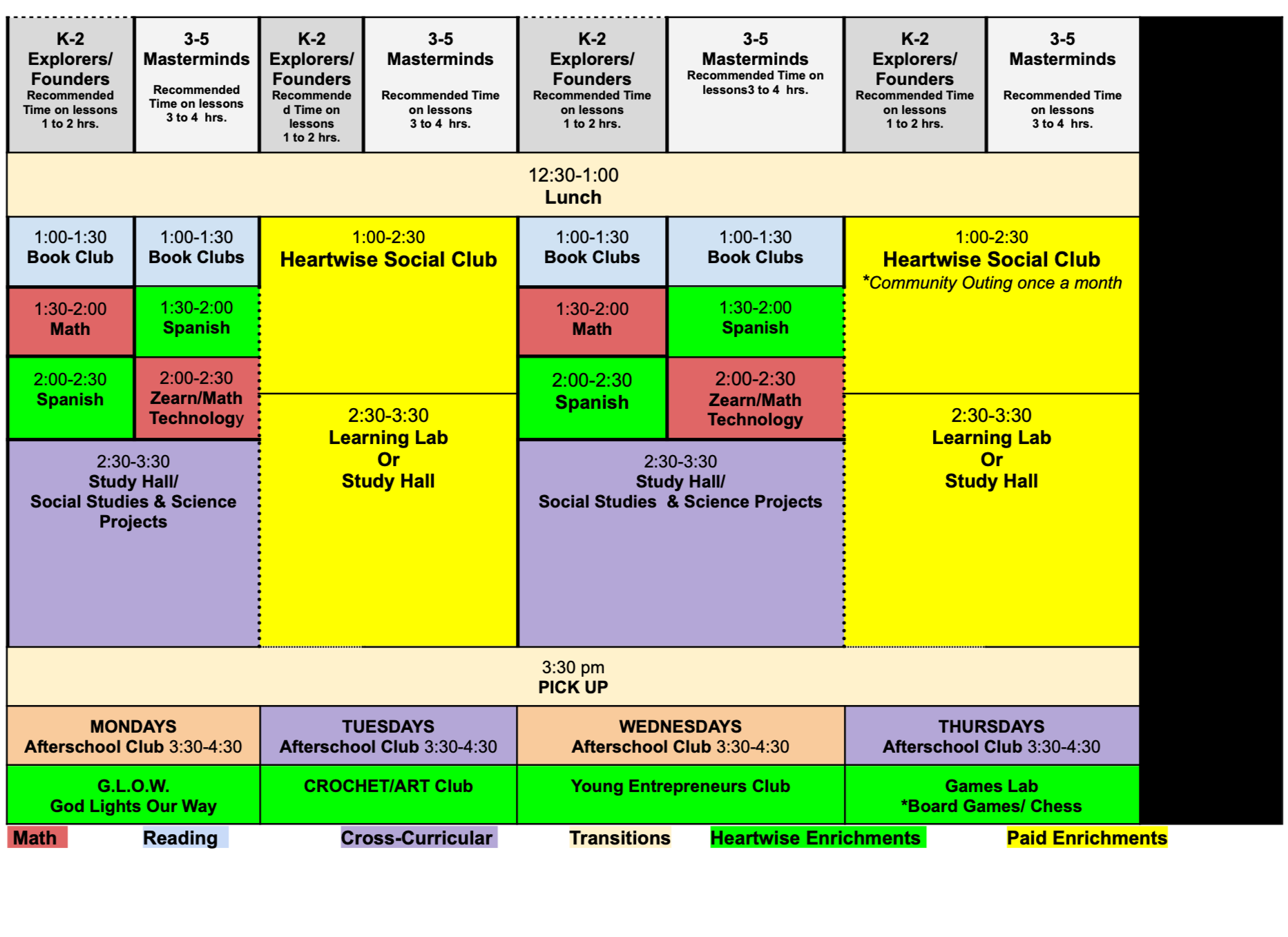 Our Elementary scholars are a mixed-aged homeschool community that meets Mondays through Thursdays from 9:30 a.m. to 3:30 p.m. at the Greenbrier Learning Center. This program focuses on Grades 1- 2 Foundational Learning (Founders) and Grades 3-5 Mastery Methods (Masterminds). Through relationship-based classroom management, scholars participate in a universal learning routine that supports diverse needs and fosters a positive, pro-social learning environment. Additionally, in collaboration with local businesses, enrichment classes and field trips are planned throughout the year to promote academic and social-emotional growth.